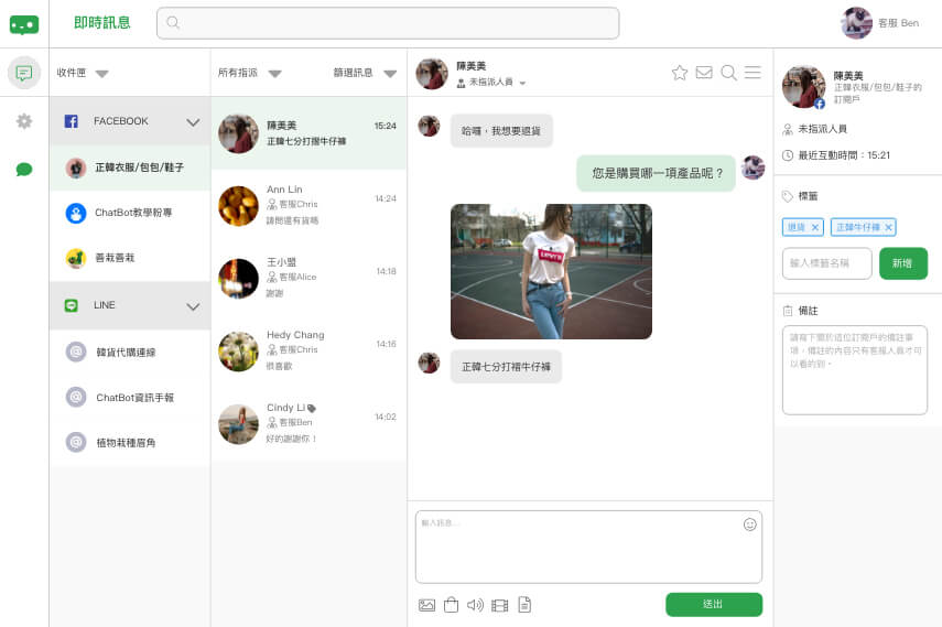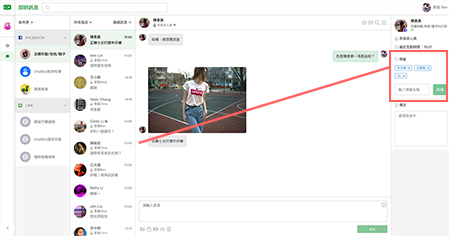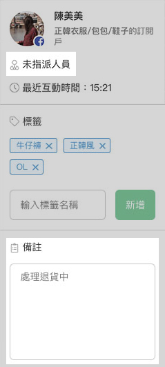 對話可指派給指定客服人員,也可篩選指定人員負責的所有對話。在備註欄寫下溝通進度,客服進度好追蹤!